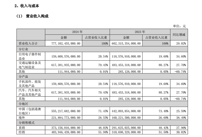 2024年年报显示,比亚迪汽车、汽车相关产品及其他产品业务的收入约6173.82亿元,同比增长27.70%,占总收入比例为79.45%;手机部件、组装及其他产品业务的收入约1596.09亿元,同比增长34.60%,占总收入比例为20.54%;其他收入达1.12亿元,同比下降60.74%,占总收入比例为0.01%。
