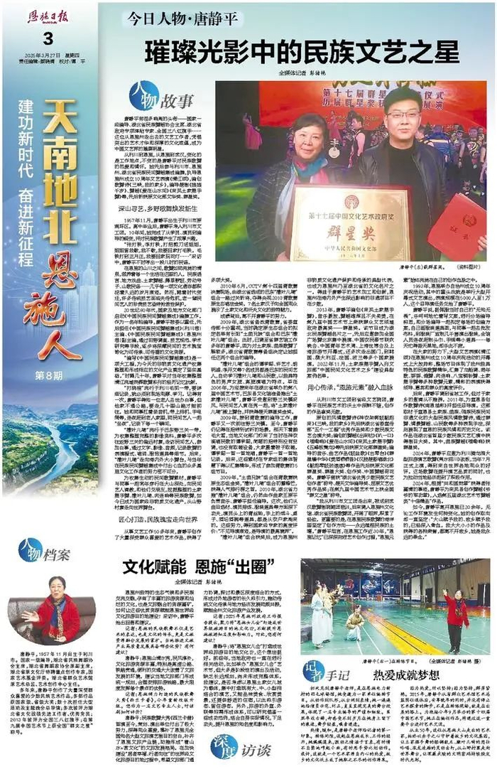 后来,唐静平调到省城工作,但对于家乡的邀请从不推辞。2011年,为宣恩县创作歌舞诗《绚恩溢彩》并担任总导演。这部取材于宣恩县土家族、苗族、侗族民族民间非遗的大型民族风情歌舞诗,通过群舞、情景舞蹈、山民歌等多种表现手法,深刻展现了宣恩的民族风情和历史文化。该作品在湖北省首届少数民族文艺汇演中获得剧目大奖。其中,苗族舞蹈《哩嘞响》获群星奖。