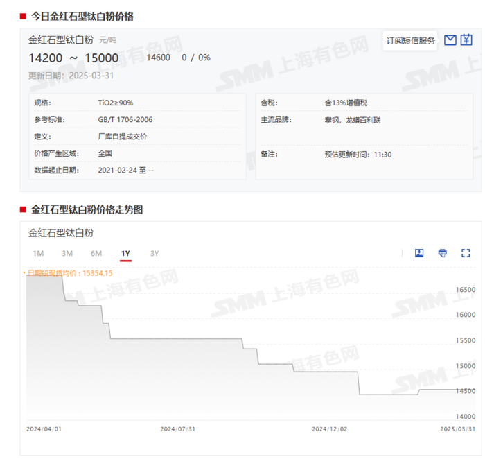 据SMM最新报价显示:3月31日,SMM金红石型钛白粉报价为14200元/吨-15000元/吨,其均价报14600元/吨,其均价自2月17日开始便持平于14600元/吨。这一均价与2024年12月31日的均价14500元/吨相比,上涨了100元/吨。