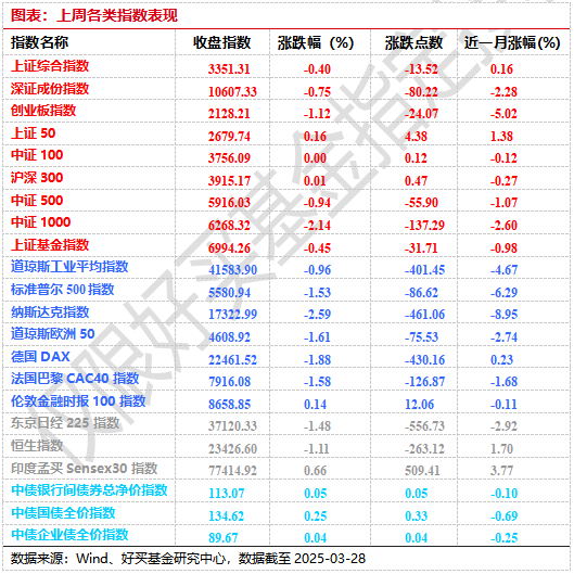 上周,沪深两市双双收跌。截止收盘,上证综指收于3351.31点,跌13.52点,跌幅为0.40%;深成指收于10607.33点,跌80.22点,跌幅为0.75%;沪深300收于3915.17点,涨0.47点,涨幅为0.01%;创业板收于2128.21点,跌24.07点,跌幅为1.12%。两市日均成交1.23万亿元。总体而言,大盘股强于小盘股。中证100上涨0.00%,中证500下跌0.94%。31个申万一级行业中有4个行业上涨。其中,医药生物、农林牧渔、食品饮料表现居前,涨跌幅分别为0.98%、0.56%、0.40%,通信、国防军工、计算机表现居后,涨跌幅分别为-3.87%、-3.98%、-4.89%。