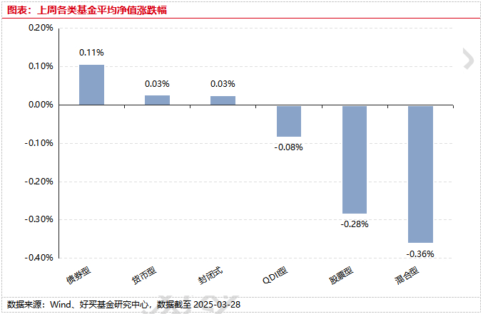 上周,国内权益基金普遍下跌,其中股票型基金平均下跌0.28%,混合型和指数型基金平均下跌0.36%和0.53%。QDII基金平均下跌0.08%。