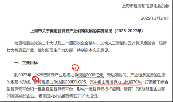 上周三盘后一个消息引起了市场关注。上海市发布了《上海市关于促进智算云产业创新发展的实施意见(2025-2027年)》,其中提出:到2027年,本市智算云产业规模力争突破2000亿元,云边端协同、产业链条完备的生态体系基本形成,并智算规模力争达到200EFLOPS,其中自主可控算力占比超70%。