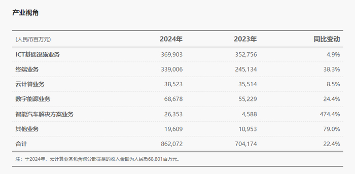 业务板块来看,2024年,华为ICT基础设施业务收入为3699.03亿元,同比增长4.9%;终端业务收入为3390.06亿元,同比增长38.3%;云计算业务收入为385.23亿元,同比增长8.5%;数字能源业务收入为686.78亿元,同比增长24.4%;其他业务收入为196.09亿元,同比增长79.0%。