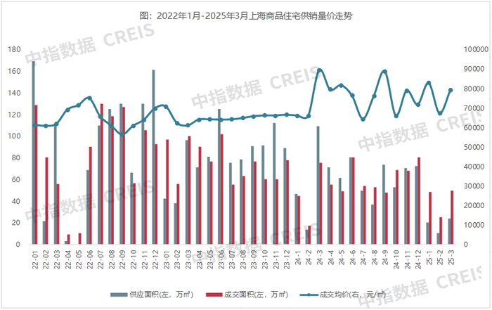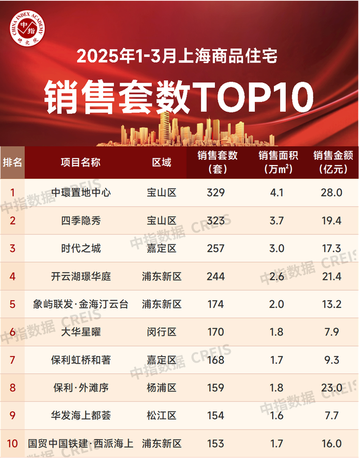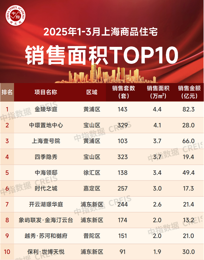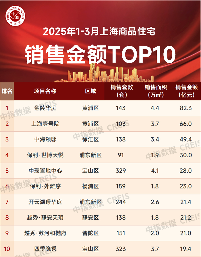 特别声明:房地产企业销售数据、项目销售数据、商品住宅市场数据统计均是以2025年1月1日-3月28日期间商品房合同销售额为统计口径,主要依据中指数据CREIS(点击查看)在上海的销售监数据;本报告仅供参考,课题组不对使用报告及其内容所引发的任何直接或间接损失承担责任。