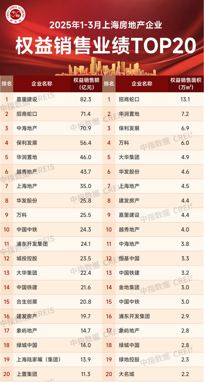 2025年1-3月,上海房地产权益销售业绩TOP20企业合计销售667.3亿元;权益销售面积TOP20企业合计销售89.4万平。权益销售额突破50亿元的房企有4家,其中嘉里建设、招商蛇口、中海地产分别以82.3亿元、71.4亿元和70.9亿元获得销售金额榜前三名;权益销售面积榜中,招商蛇口、华润置地、保利发展分别以13.1万平、7.2万平和6.9万平获得前三名。