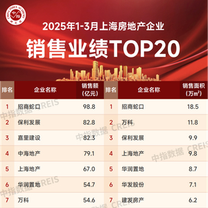 2025年1-3月,上海房地产销售业绩TOP20企业合计销售897.9亿元;销售面积TOP20企业合计销售130.8万平。销售额突破50亿元的房企有7家,其中招商蛇口、保利发展、嘉里建设分别以98.8亿元、82.8亿元和82.3亿元获得销售金额榜前三名;销售面积榜达到5万平以上的房企有11家,招商蛇口、万科、保利发展分别以18.5万平、11.8万平和9.9万平获得前三名。