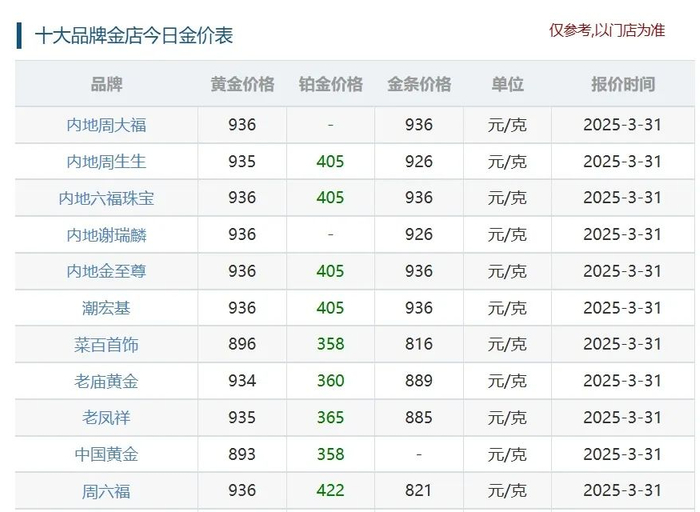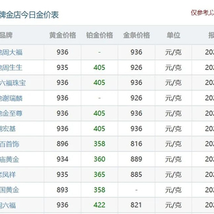 黄金珠宝品牌的首饰金价格也水涨船高。3月31日,多家国内黄金珠宝品牌的金饰价格均突破935元/克。当日,周大福足金、六福珠宝足金999/足金、潮宏基足金、谢瑞麟足金饰品、周六福足金饰品的境内价格达936元/克;周生生、老凤祥足金饰品境内价格为935元/克;老庙黄金上海区域足金饰品价格为934元/克。