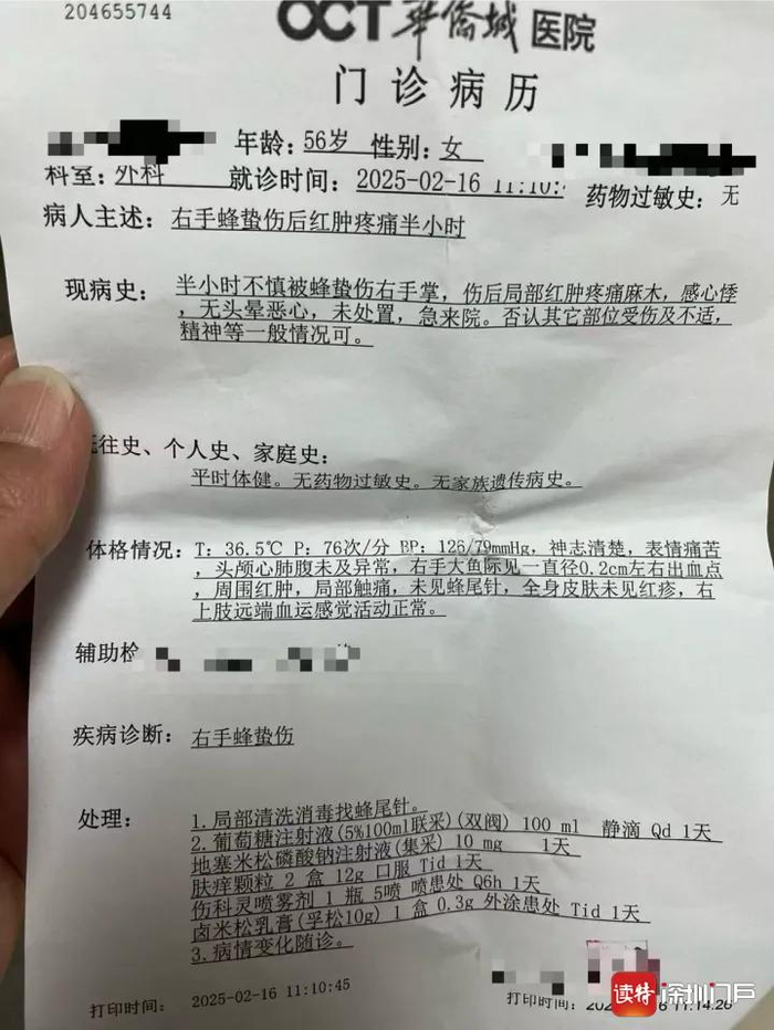 2月16日,市民张女士在广东深圳山姆会员商店(福田店)选购蔬菜时,手部被一只马蜂蛰了肿了起来。现场工作人员查看后,陪同张女士到医院就诊。经医生诊断,张女士手掌出现局部红肿疼痛麻木,并出现心悸反应,未有马蜂尾针残留。经过处理后,目前张女士已无大碍。