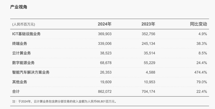整体业务进展方面,华为表示,2024年,华为联接产业克服行业投资周期低谷,经营结果保持稳健;计算产业得益于提前十年的布局,抓住AI机会取得较大增长;终端重回增长快车道,鸿蒙生态正在取得历史性突破;华为云持续优化业务结构;数字能源坚持质量优先;智能汽车解决方案首次实现当年盈利。
