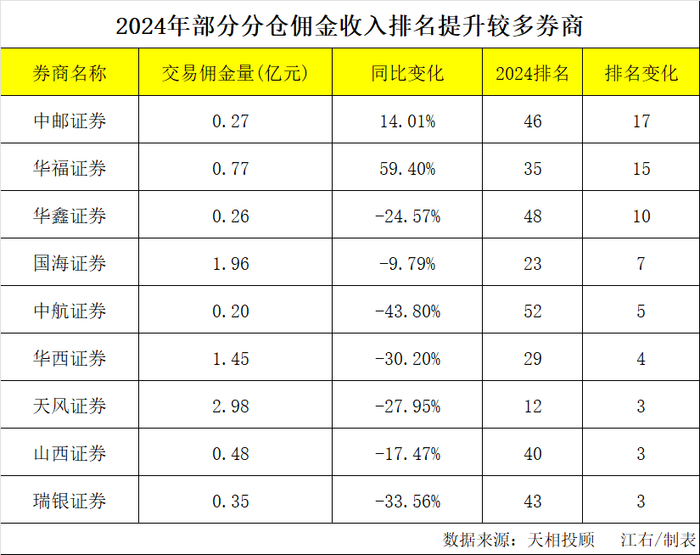 在10名之外的券商中,分仓收入超2000万元的中小券商,比如中邮证券、华福证券、华鑫证券、国海证券、中航证券等排名进步也很明显。比如国海证券2024年分仓佣金收入还有1.96亿元,较上一年的降幅不到10%,排名从第30名前进到第23名。