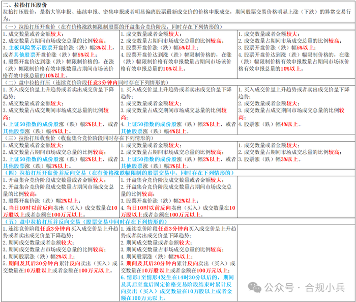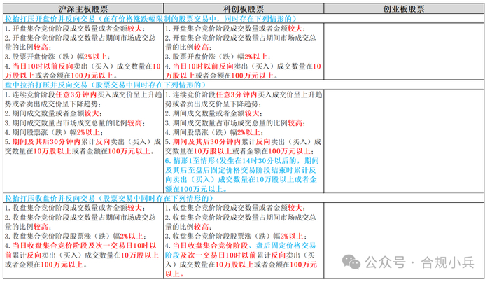 创业板沿用2020年6月发布的5类11条认定标准,沪深主板和科创板在2023年2月新发布(修订)时,新增了拉抬打压并反向交易的3条(包括“拉抬打压开盘价并反向交易”、“盘中拉抬打压并反向交易”、“拉抬打压收盘价并反向交易”),共5类14条。