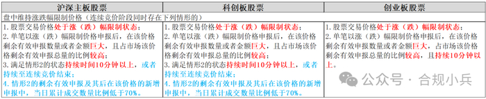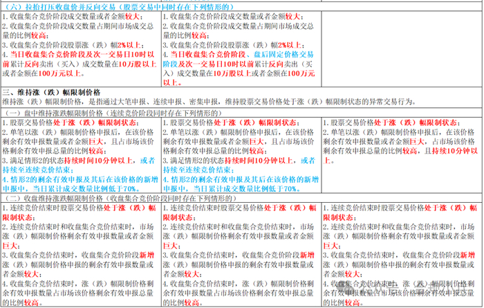 盘中维持涨跌幅限制价格,主要关注股票处于涨跌停状态后的申报、申报后市场剩余有效申报量和申报占比、持续时间等,对于沪深主板和科创板,进一步优化了持续时间的认定,增加了当日累计成交数量比例的考量要素。