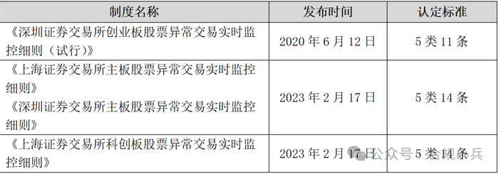 2019年3月,沪、深交易所联合发布了《会员客户股票交易行为监测监控参考要点》,首次提出了4类10条明确的量化认定标准,,供会员开展客户交易行为管理工作参考使用。2019年6月科创板开板、2020年6月创业板改革,沪深交易所分别向全市场公开发布了科创板和创业板的异常交易实时监控细则,明确了5类11条认定标准。2023年2月,全面实行注册制改革,沪深交易所公开发布了主板股票的监控细则,同时上交所修订发布了科创板的监控细则,明确了5类14条认定标准。现行异常交易监控细则具体如下: