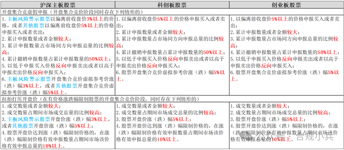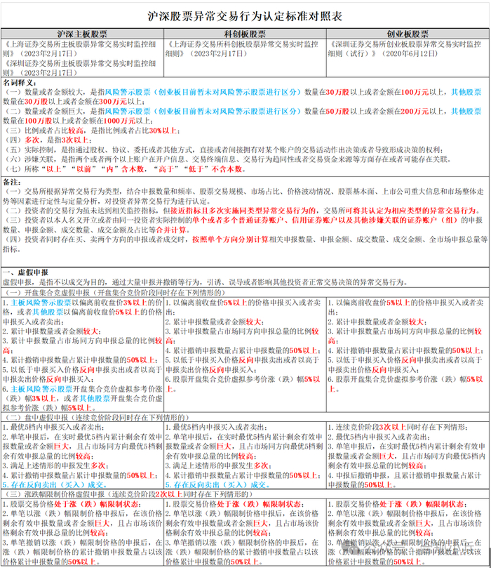 笔者以公开发布的规则为基础,整理了各类型异常交易行为的具体量化认定标准,并对沪深主板、科创板、创业板之间的差异进行横向对比,形成《沪深交易所股票异常交易行为认定标准对照表》,供同仁学习交流。