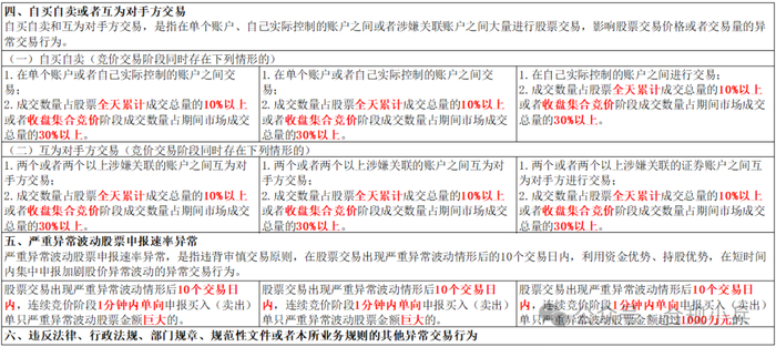 盘中虚假申报,主要关注3次以上最优5档内的申报、市场剩余有效申报量、申报占比、撤单率,对于沪深主板和科创板,新增了“存在反向卖出(买入)成交”的认定。