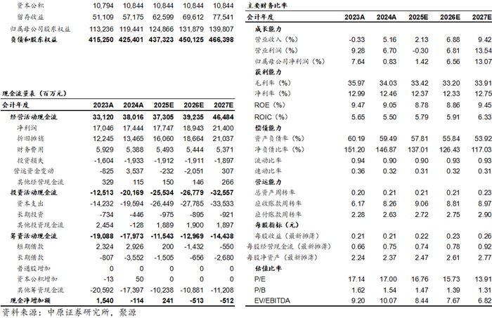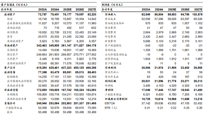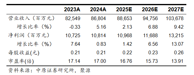 预计公司2025—2027年归属于上市公司股东的净利润分别为109.68亿元、116.88亿元和132.15亿元,对应每股收益为0.22、0.23和0.26元/股,按照3月28日3.64元/股收盘价计算,对应PE分别为16.76X、15.73X和13.91X,考虑到公司估值水平和行业发展前景,维持公司“增持”投资评级。