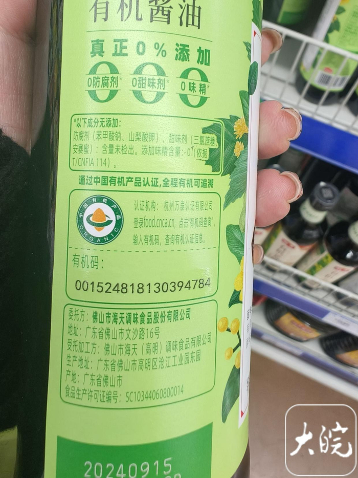 值得注意的是,即使同一品类,0添加的概念也不尽相同。同样价格较高的一款有机酱油,不仅标注“真正0%添加”,还用明显的红字标注“只有6种原料 其他没了”字样。在包装背后,则写有“以下成分无添加:防腐剂(苯甲酸钠、山梨酸钾)、甜味剂(三氯蔗糖、安赛蜜):含量未检出。添加味精含量:0(依据T/CNFIA114)。”