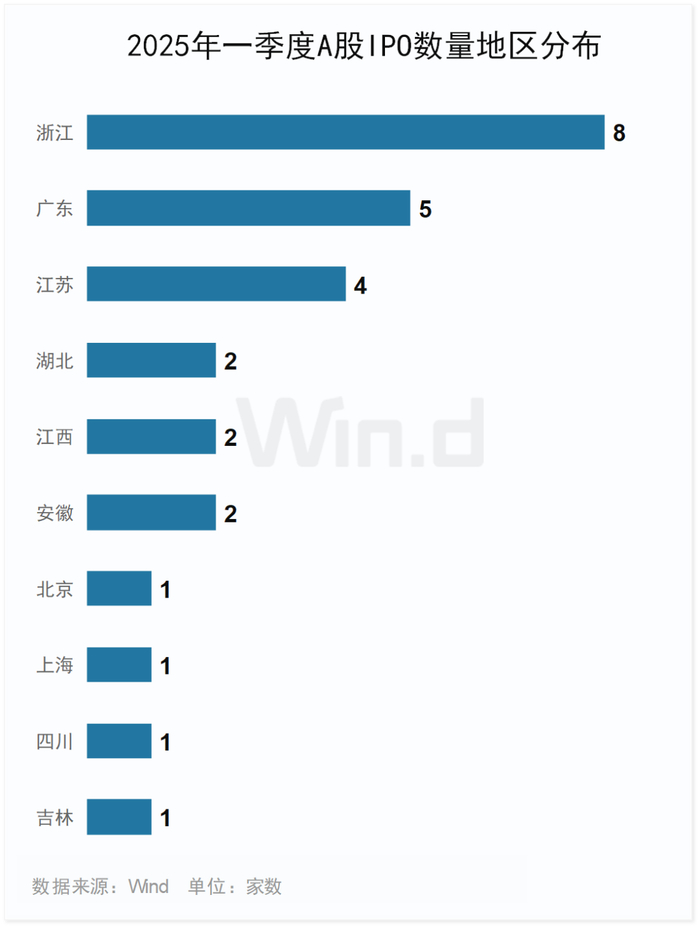 2025年一季度A股IPO发行的27家公司中,来自浙江的公司共有8家,数量居首;来自广东、江苏的公司分别有5家、4家。