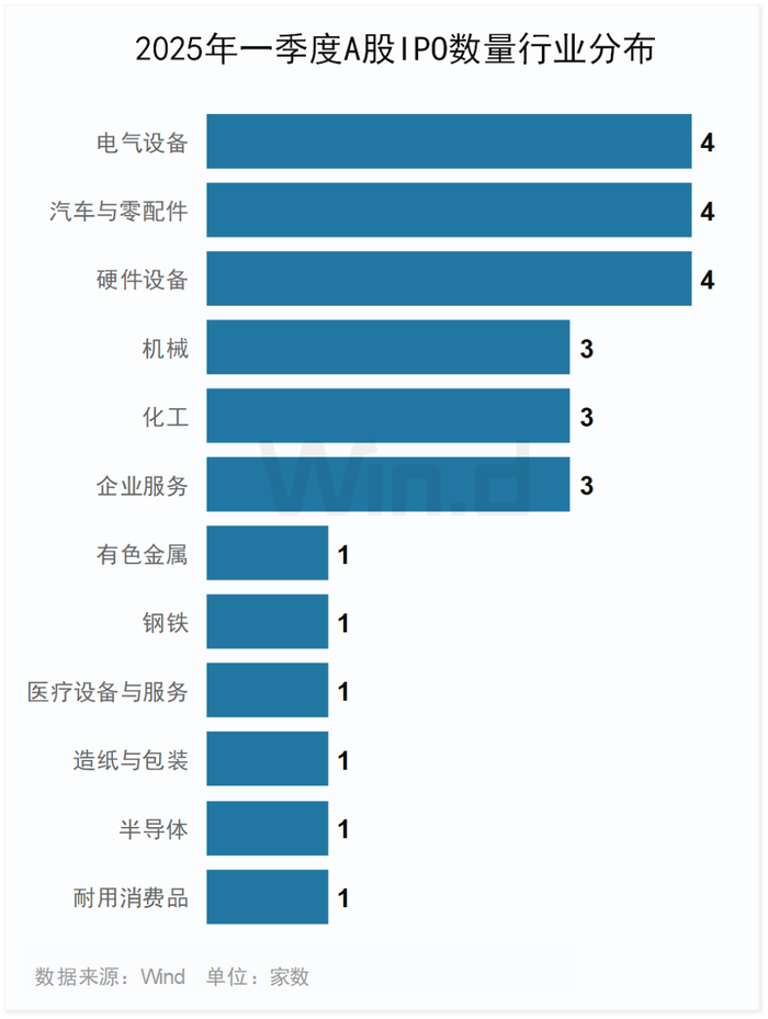 2025年一季度A股IPO发行的27家公司中,来自电气设备、汽车与零配件、硬件设备行业的公司均为4家,数量居首;来自机械、化工、企业服务行业的公司均为3家。