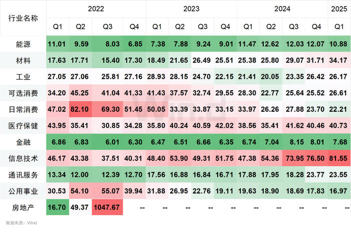 截至2025年一季度末,在Wind一级行业分类的11个行业中(因2022年四季度以来房地产行业持续亏损,不予计算),信息技术行业的市盈率最高,为81.55倍。金融行业的市盈率最低,为7.68倍。