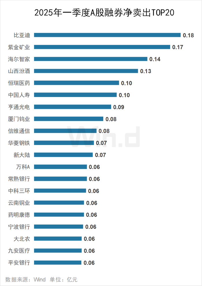 2025年一季度比亚迪遭融券净卖出0.18亿元居首;紫金矿业、海尔智家分别遭融券净卖出0.17亿元、0.14亿元。
