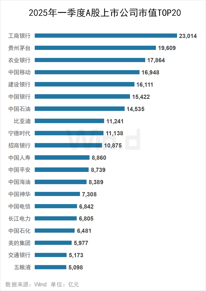 截至2025年一季度末,工商银行位居上市公司市值榜榜首,总市值达23014亿元;贵州茅台紧随其后,总市值为19609亿元。此外,农业银行、中国移动、建设银行、中国银行、中国石油、比亚迪、宁德时代、招商银行总市值均超万亿。