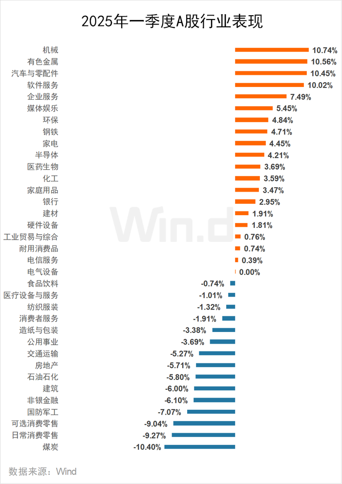 在Wind二级行业分类的35个行业中,2025年一季度共有20个行业录得上涨。机械行业涨幅居首,累计上涨10.74%;有色金属、汽车与零配件、软件服务行业分别上涨10.56%、10.45%、10.02%。煤炭行业表现垫底,累计下跌10.40%;日常消费零售、可选消费零售行业分别下跌9.27%、9.04%。