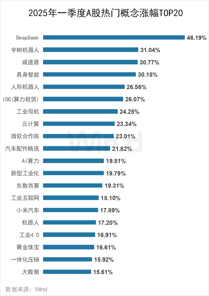 2025年一季度,人工智能、机器人、新能源车等概念表现强势。Deepseek概念涨幅居首,累计上涨46.19%,IDC(算力租赁)概念上涨26.07%;宇树机器人、减速器概念分别上涨31.04%、30.77%;汽车配件精选、小米汽车概念分别上涨21.82%、17.89%。