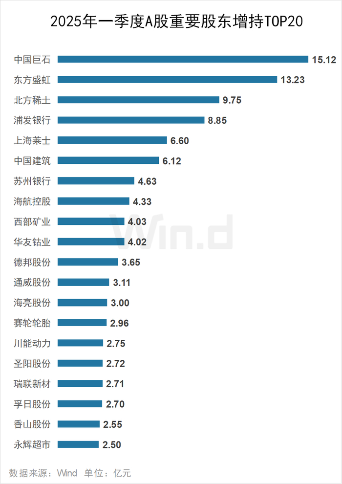 2025年一季度中国巨石获重要股东增持15.12亿元,位居增持榜榜首;东方盛虹紧随其后,获重要股东增持13.23亿元,北方稀土、浦发银行分别获重要股东增持9.75亿元、8.85亿元。