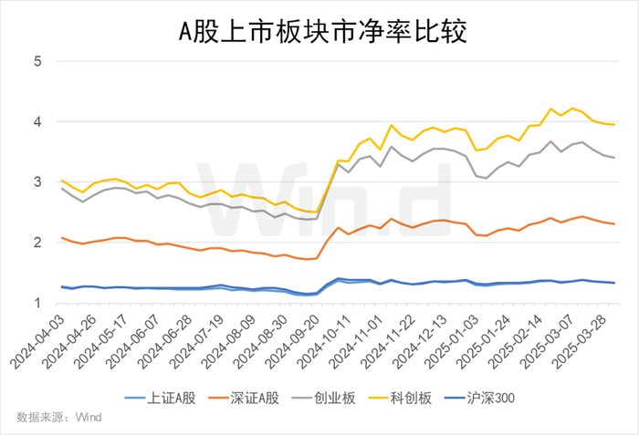 截至2025年一季度末,科创板市净率最高,为3.95倍;创业板、深证A股市净率分别为3.41、2.31倍。沪深300、上证A股的市净率较低,均为1.33倍。