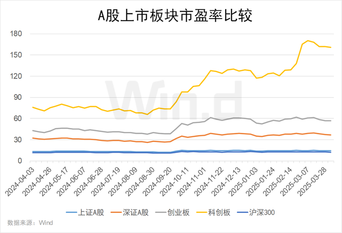 截至2025年一季度末,科创板市盈率最高,为160.99倍;创业板、深证A股市盈率分别为56.60倍、36.90倍。上证A股、沪深300的市盈率较低,分别为14.34倍、12.38倍。