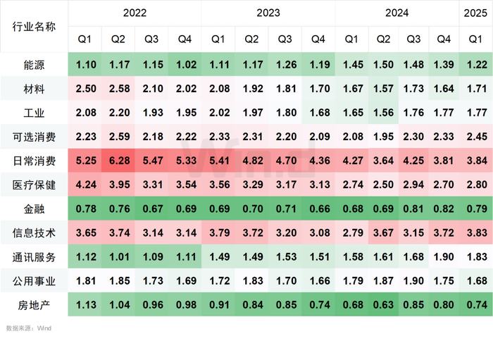 截至2025年一季度末,在Wind一级行业分类的11个行业中,日常消费行业的市净率最高,为3.84倍。金融、房地产行业均破净,市净率分别为0.79倍、0.74倍。