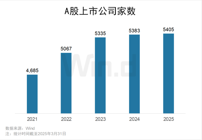 截至2025年一季度末,A股市场共有5405家上市公司,较2024年末增加22家公司。