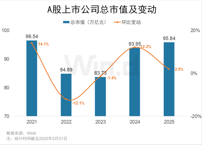 截止2025年一季度末,A股市场总市值约95.84万亿元,较2024年末上升2.0%。