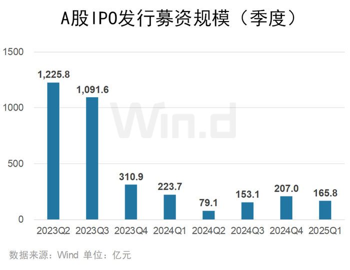 2025年一季度A股市场IPO募资规模为165.8亿元,较2024年四季度下降19.90%。