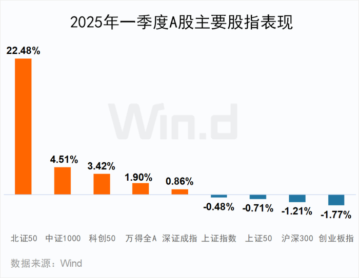 2025年一季度A股主要股指多数呈上涨态势。北证50指数表现最强,累计上涨22.48%,中证1000、科创50、万得全A、深证成指均录得上涨。