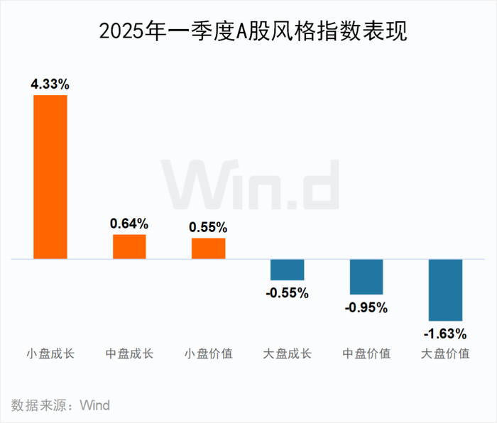 2025年一季度A股成长风格表现较优。小盘成长风格指数表现最为强势,累计上涨4.33%;中盘成长、小盘价值指数分别上涨0.64%、0.55%。大盘成长、中盘价值、大盘价值指数出现下跌,跌幅分别为0.55%、0.95%、1.63%。