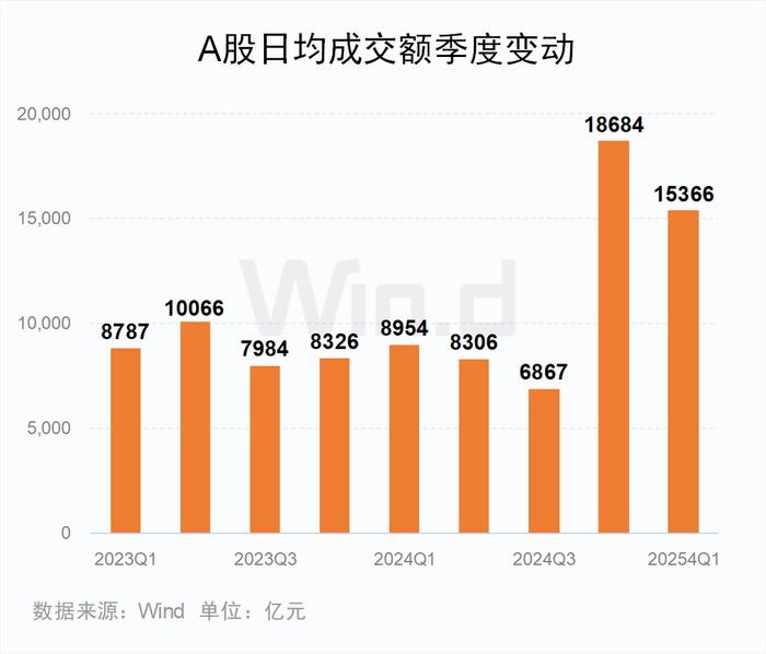 2025年一季度A股市场总成交额为86.9万亿元,同比增长67.44%,环比下降23.10%;日均成交额为15366亿元,同比增长71.61%,环比下降17.76%。
