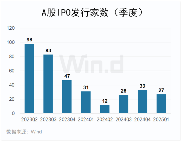 2025年一季度A股市场IPO发行数量为27家,较2024年四季度下降6家。