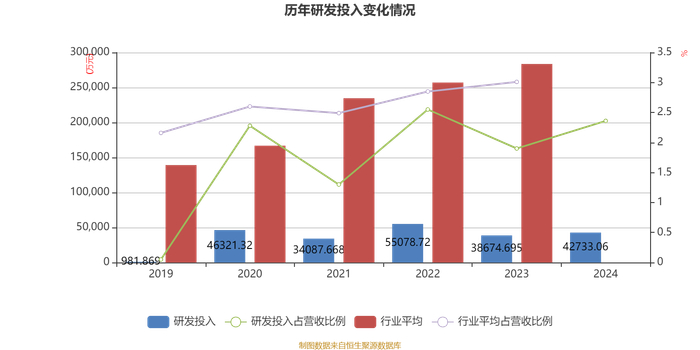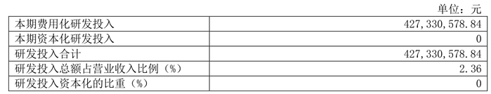 2024年全年,公司研发投入金额为4.27亿元,同比增长10.49%;研发投入占营业收入比例为2.36%,相比上年同期上升0.46个百分点。此外,公司全年研发投入资本化率为0%。