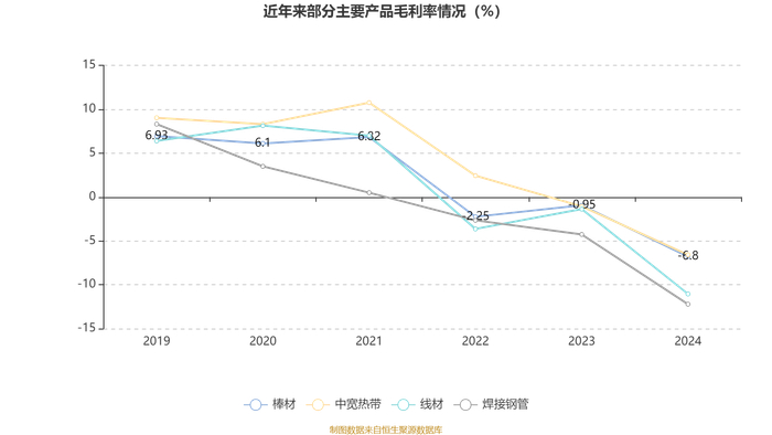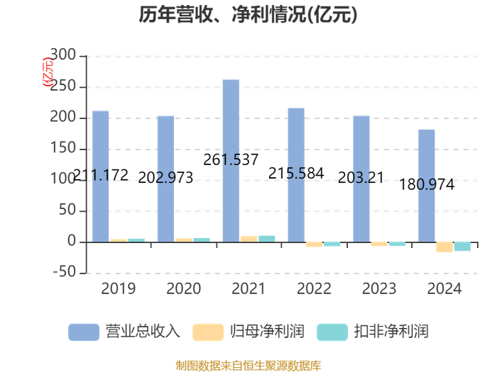 中证智能财讯凌钢股份(600231)4月1日披露2024年年度报告。2024年,公司实现营业总收入180.97亿元,同比下降10.94%;归母净利润亏损16.78亿元,上年同期亏损6.81亿元;扣非净利润亏损14.71亿元,上年同期亏损6.64亿元;经营活动产生的现金流量净额为-9.8亿元,上年同期为17.15亿元;报告期内,凌钢股份基本每股收益为-0.59元,加权平均净资产收益率为-25.62%。