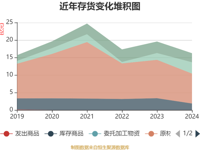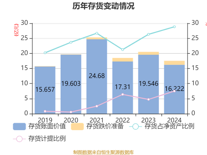 从存货变动来看,截至2024年末,公司存货账面价值为16.22亿元,占净资产的28.83%,较上年末减少3.32亿元。其中,存货跌价准备为1.32亿元,计提比例为7.5%。