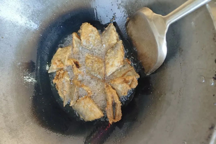 4.待油温二次升至八成热,倒入带鱼复炸30秒至1分钟,至表面金黄酥脆,捞出控油。