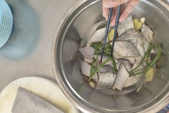 1.剪掉带鱼头和鱼鳍,去除内脏和黑膜,切成小段。清洗干净,沥干水分加姜片、葱段、料酒、盐、胡椒粉,抓匀腌制20分钟。