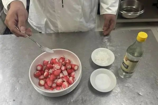 1.杨花萝卜洗净,去除根须,放入大碗备用。