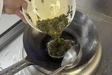 3.热锅倒油,油热后倒入香椿蛋液。待蛋液底部稍微凝固后,用铲子轻轻翻动,炒至鸡蛋完全凝固、香椿熟透。