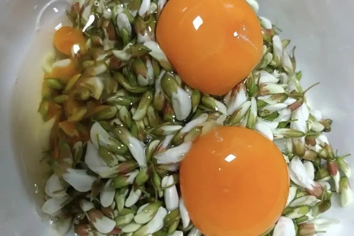 1.将洋槐花用盐水浸泡10分钟,去除杂质和虫卵,沥干水分。冷水下锅焯烫30秒(加少许盐和油),捞出过凉水,挤干水分备用。