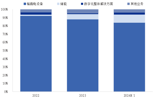 营收盈利增长稳健。公司发展稳健,营业收入从2020年24.2亿元增长到2024Q1-3的47.99亿元,归母净利润从2020年2.32亿元增长到2024Q1-3的4.04亿元,主要得益于公司拓宽产品领域,拓展新客户、新市场。按产品结构来看,公司收入以输变电设备为主,2022年、2023年,干式变压器收入分别占总收入的68.87%、61.38%;储能及数字化解决方案收入加速兑现。按下游行业结构来看,2023年公司新能源下游收入占比 56%,其中光伏(51%)、风电(30%);非新能源领域中,收入占比43%,其中工业企业电气配套(42%)、基础设施(19%)。受光伏、风电等下游需求阶段性疲软和行业竞争加剧影响,公司241国内新能源收入同比下降19.29%,但新基建业务增长支撑国内营收稳中向好。24H1国内重要基础设施、发电及供电、新基建领域的销售收入分别同比增长104.7%、67.4%和83.4%,最后内销总收入同比下降10.02%。