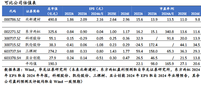 盈利预测及投资评级:公司是全球最大石板轻钢龙骨产业集团,防水和涂料业务“两翼齐飞”,国际化业务持续增长。我们假设公司2025-2027年营业收入增速为11.61%、12.33%、11.97%。因市场深度调整,公司2024年业绩承压,我们下调2025、2026年盈利预测,我们预计公司2025-2027年分别实现营业收入288.20亿元(原预测值为307.68亿元)、323.73亿元(原预测值为343.27亿元)、362.49亿元,归母净利润44.62亿元(原预测值为49.90亿元)、49.99亿元(原预测值为56.58亿元)、56.16亿元,当前股价对应PE分别为11.0、9.8、8.7倍。参考2025年可比公司平均估值27.1倍PE,维持“增持”评级。