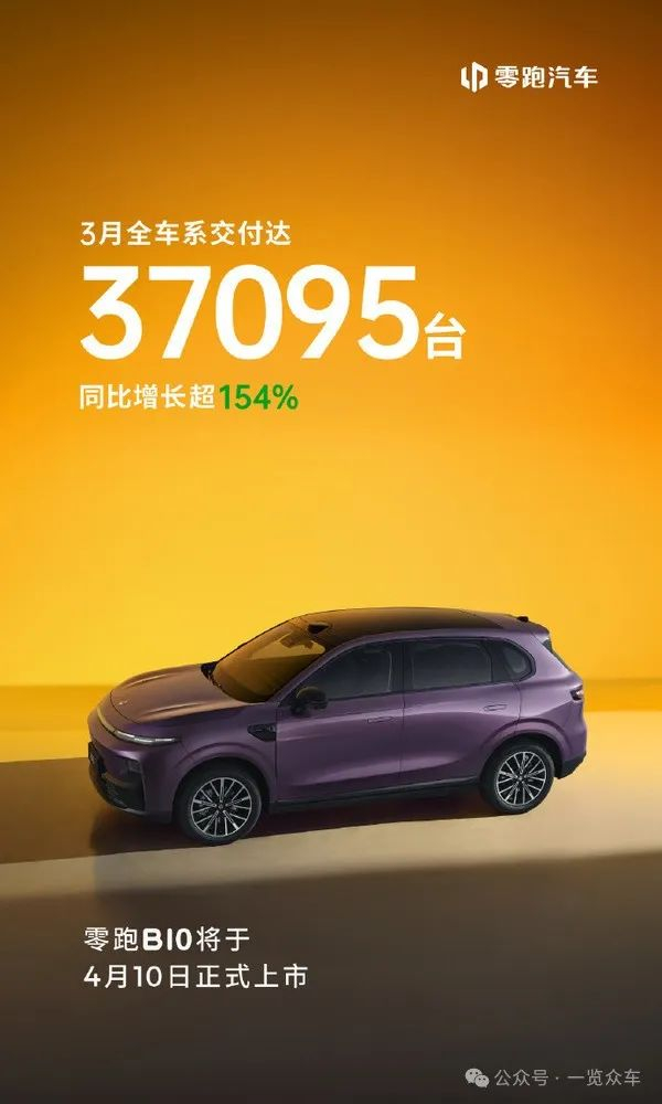 2025年3月,零跑汽车交付量37095台,同比增长超154%。